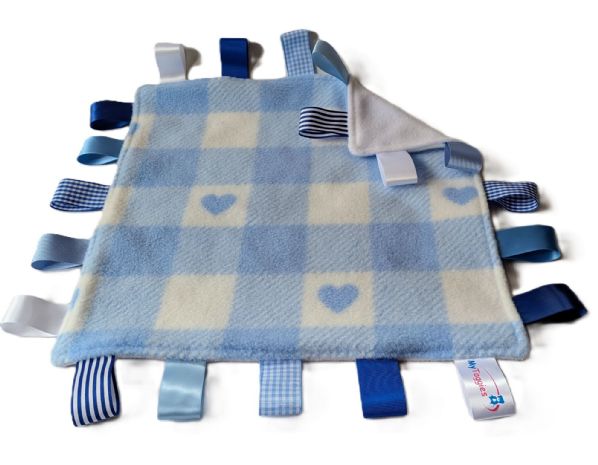MyTaggies “Fleece” taggy blankets feature patterned fleece fabrics with textured, satin and patterned tag ribbons. Heart Fleece fabric FRONT and plain fleece fabric BACK